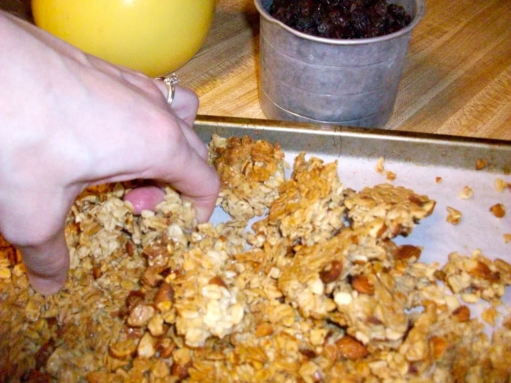 5. Cool on a wire rack to room temperature, about 1 hour. Break cooled granola into pieces of desired size. Stir in dried fruit. I used a mixture of craisins and raisins, but I also like to use chopped dried apricots, too