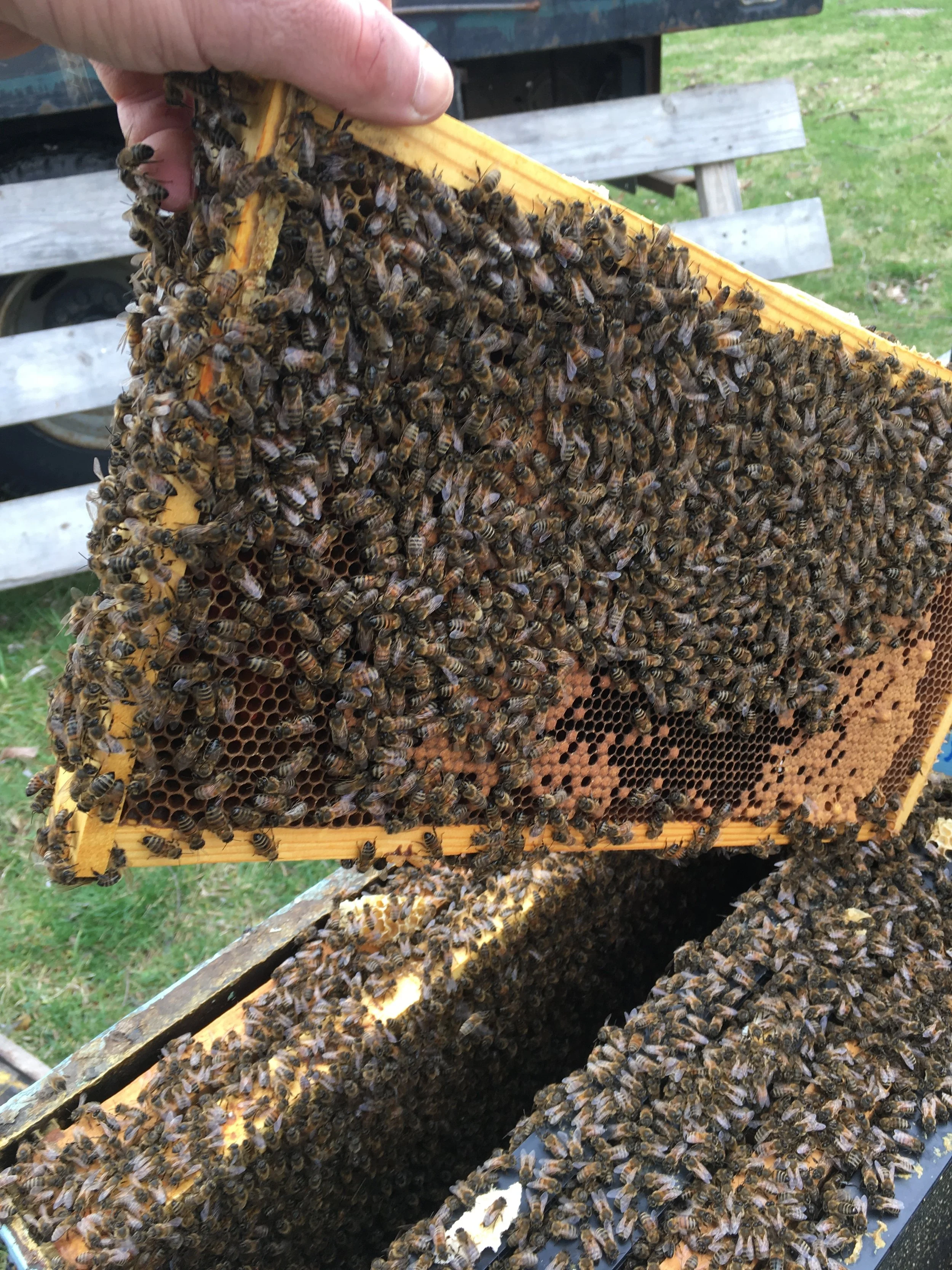 Hive after hive, just bursting at the seams. I've never seen them looking so good at such an early date. But maybe I said that last year, I don't know? It was our spring in February that did it, of course. A few 75 degree days can trick about anyone. Even maple trees and queen honeybees. The result: now we've got a lot of mouths to feed.
