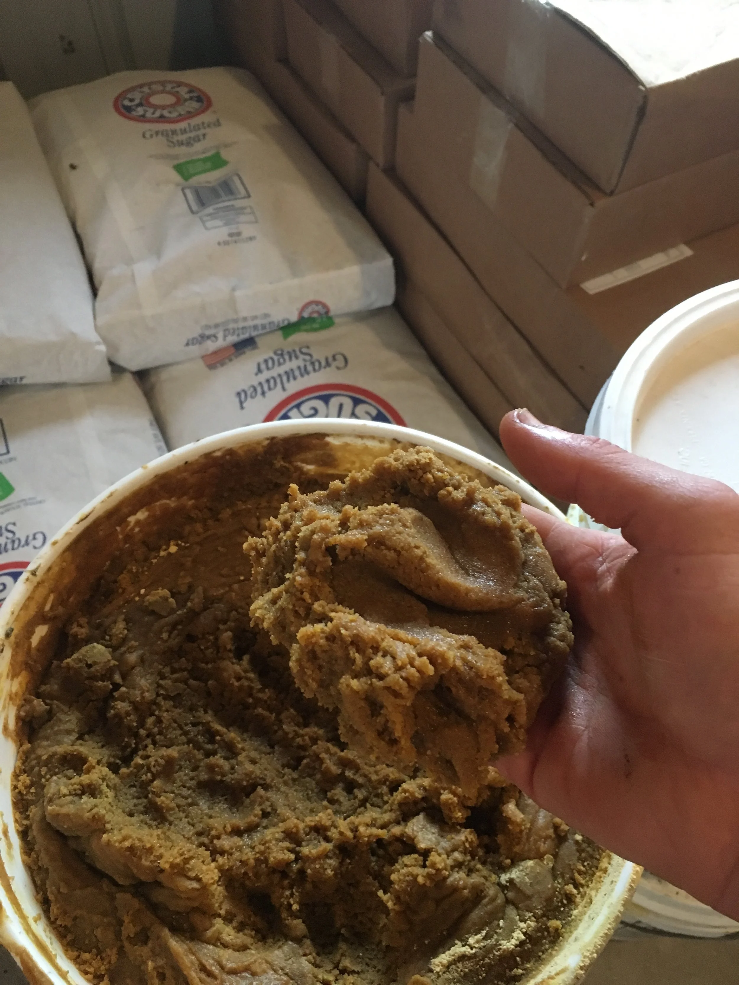 Now I'm mixing feed for round four. In March, the bees need a bit more protein. And protein is expensive, especially in patty form. To lesson the impact, I'm mixing it myself this year. The only casualties: a little more time and a couple burnt drills.