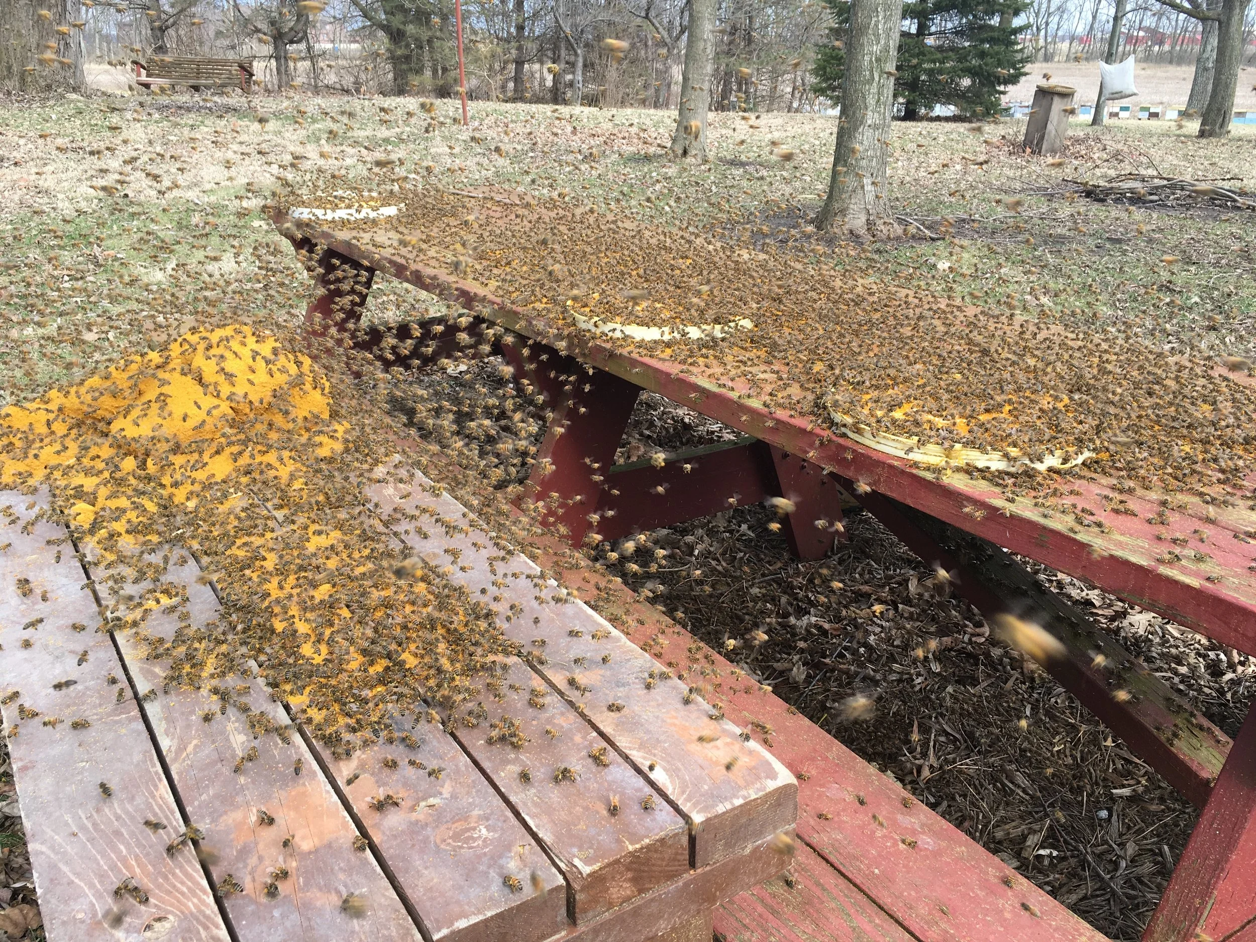 The maples have just now started to bloom. We've got a little warmth, but the rain is preventing the girls from making it out for any length of time. You can see they're desperate for protein. I put out some pollen dust a few days ago and this was the scene: