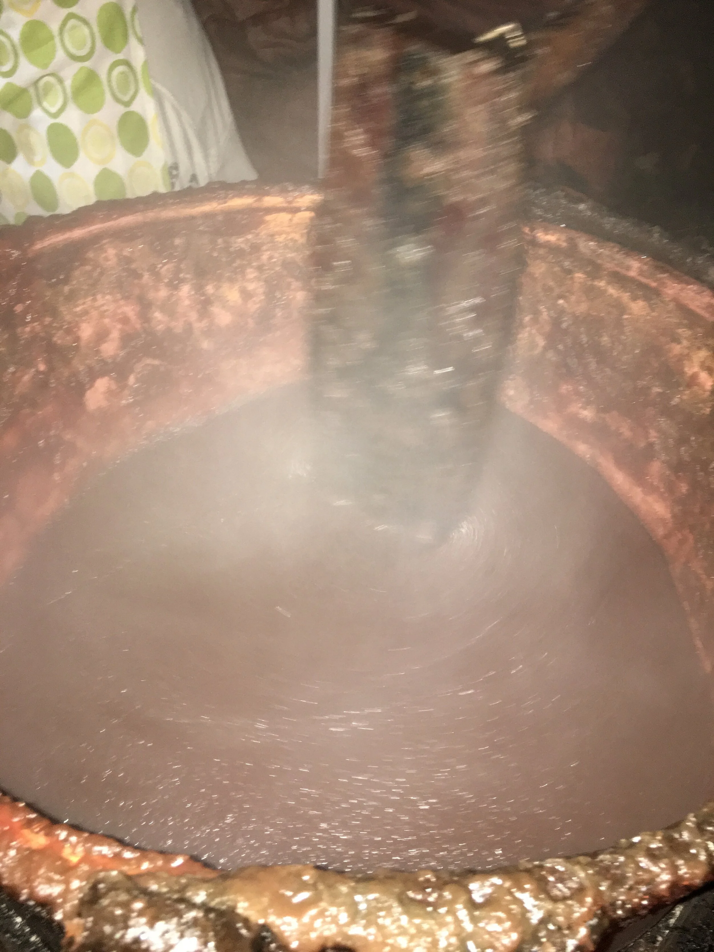 For about 20 minutes it’s coordinated madness. The big copper cauldron is quickly lifted, the hot stand quickly moved, the tables shifted, and the pouring begins. In assembly line fashion.